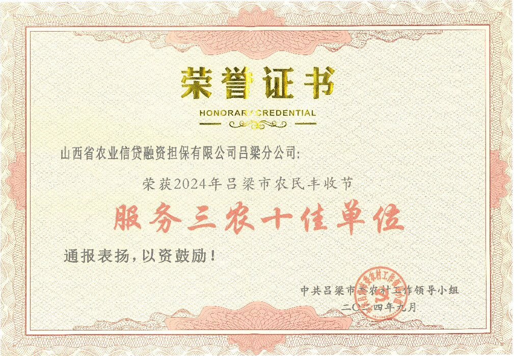 吕梁分公司自成立以来,始终坚持“为农、扶农、助农、惠农”理念,积极支持农业适度规模经营主体发展,全面贯彻落实省财政各项支农政策。通过与当地政府部门及金融机构对接沟通,实现了全市政担合作的全覆盖,同时与多家金融机构开展了良好的业务合作。截至2024年9月25日,吕梁分公司已累计为吕梁市农业适度规模经营主体提供担保6589笔31.62亿元,根据省财政贴息奖补政策发放财政奖补资金4889笔4800余万元,有效缓解了农业适度规模经营主体的融资难、融资贵问题,为吕梁市农业发展提供了有力支持,充分彰显了政策性农业担保机构的责任担当。此次荣获“服务三农十佳单位”荣誉,体现了吕梁市政府对山西农担吕梁分公司助农惠农工作成效的充分肯定。