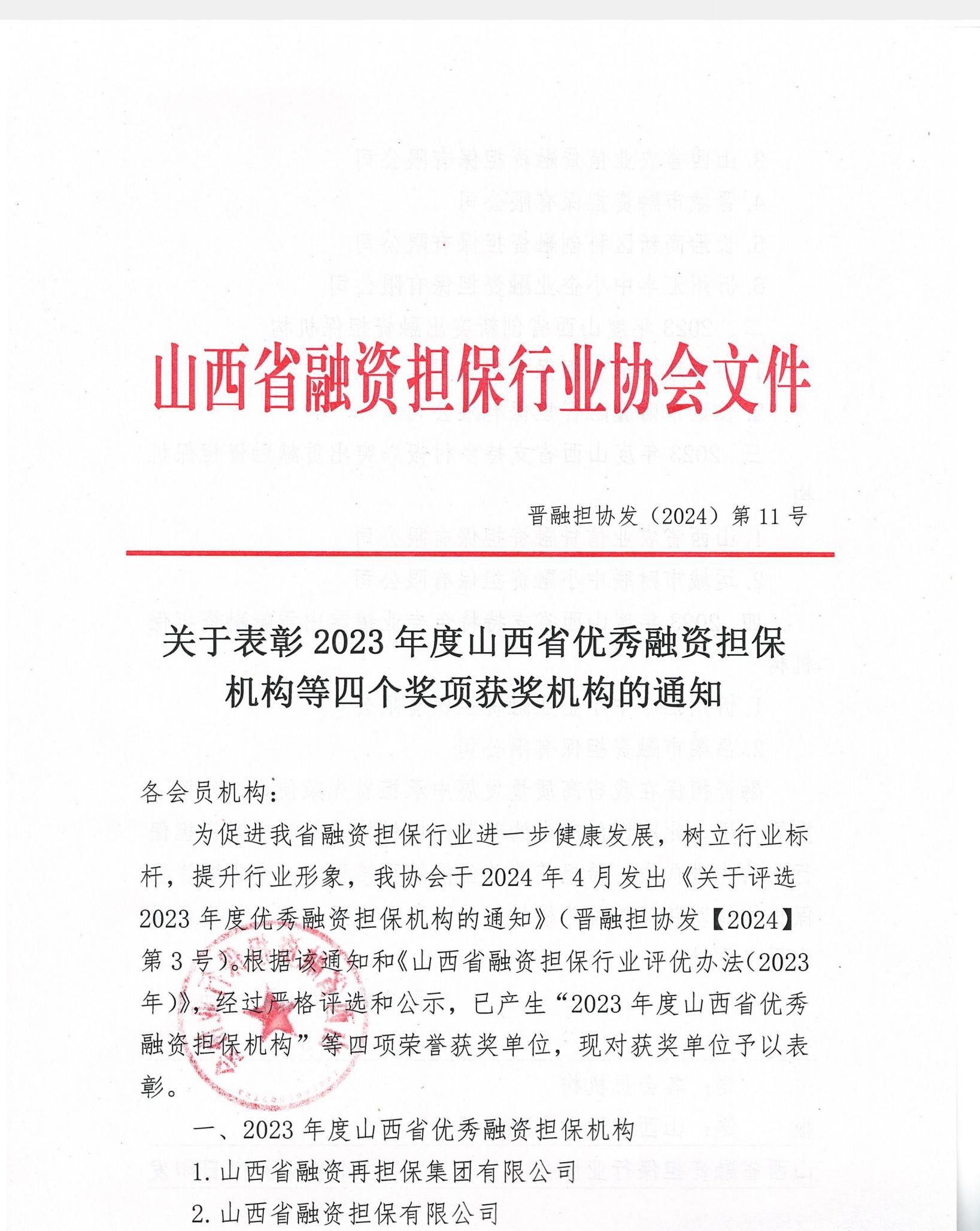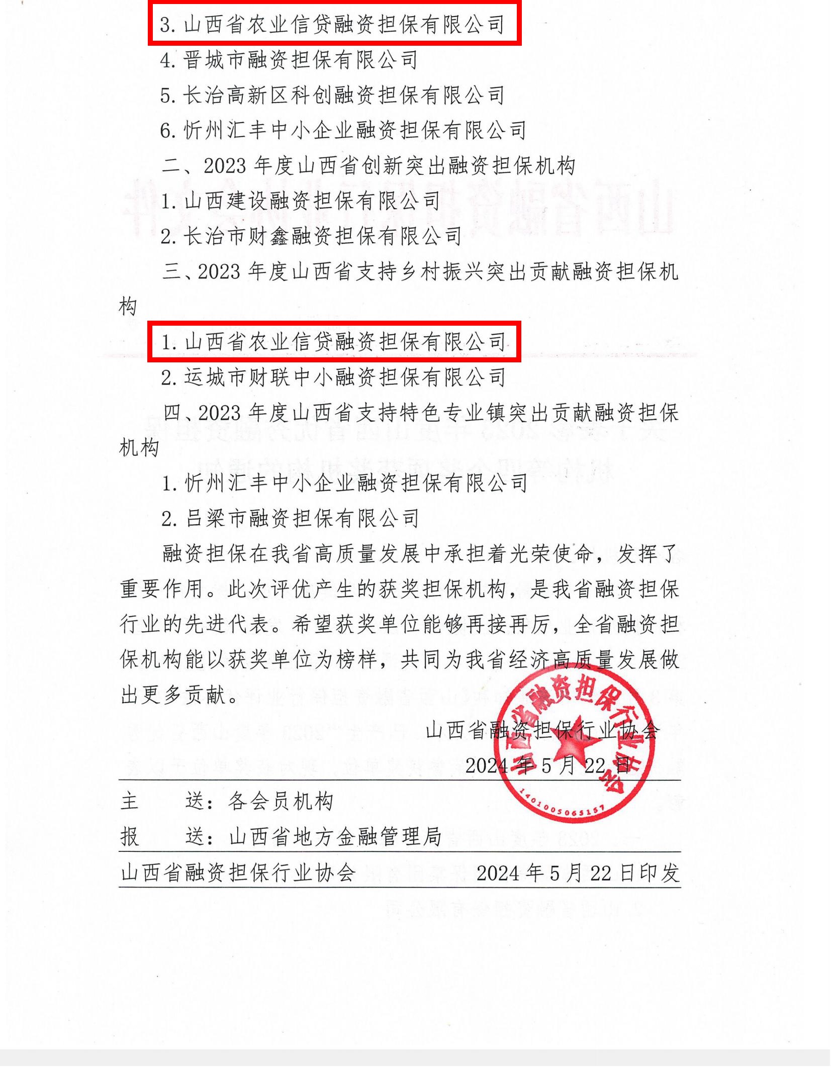 5月22日,山西省融资担保行业协会印发了《关于表彰2023年度山西省优秀融资担保机构等四个奖项获奖机构的通知》(晋融担协发〔2024〕第11号),经省融资担保行业协会组织评选,山西省农业信贷融资担保有限公司荣获“2023年度山西省优秀融资担保机构”和“2023年度山西省支持乡村振兴突出贡献融资担保机构”两项荣誉。以下为通知全文: