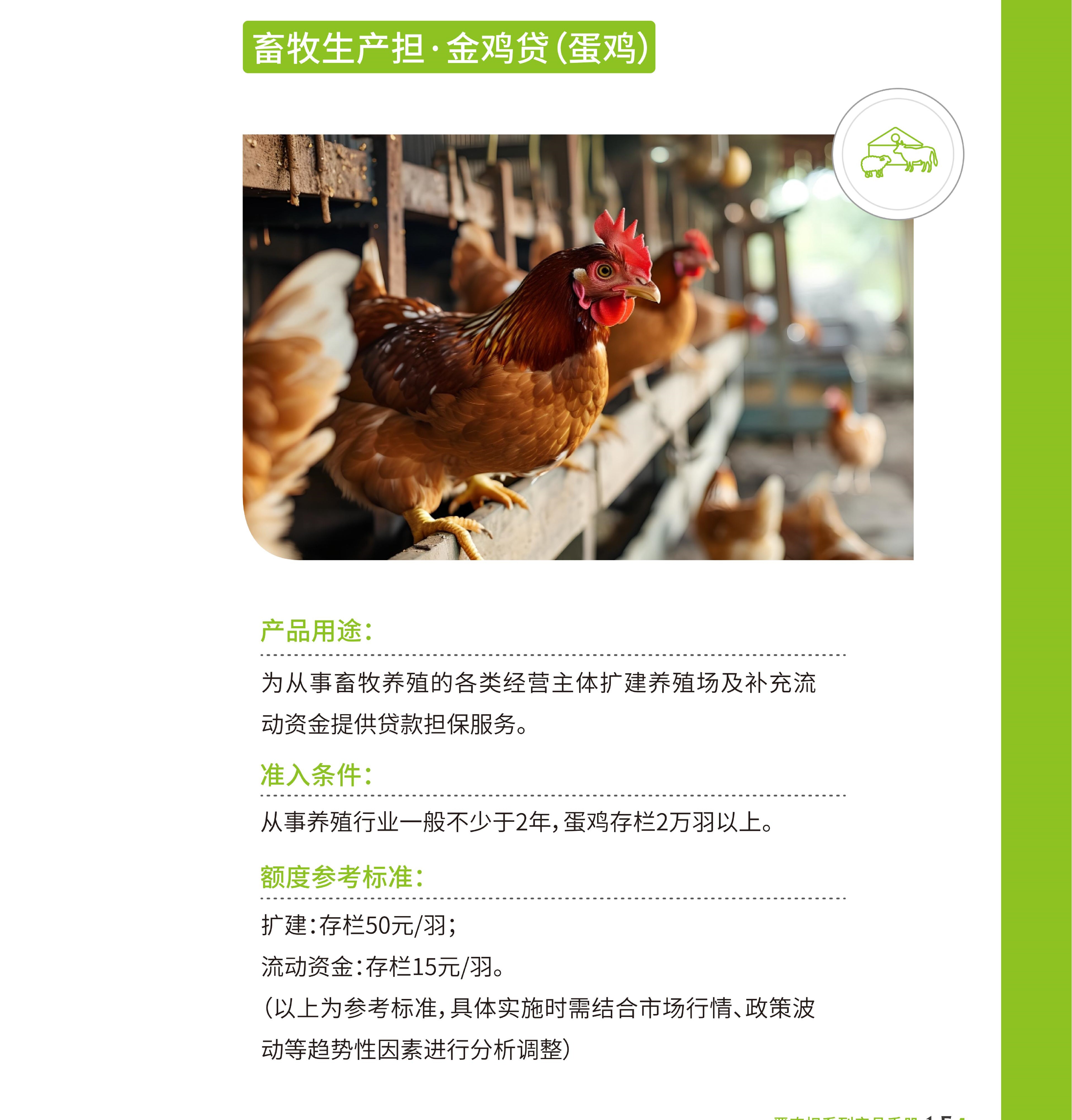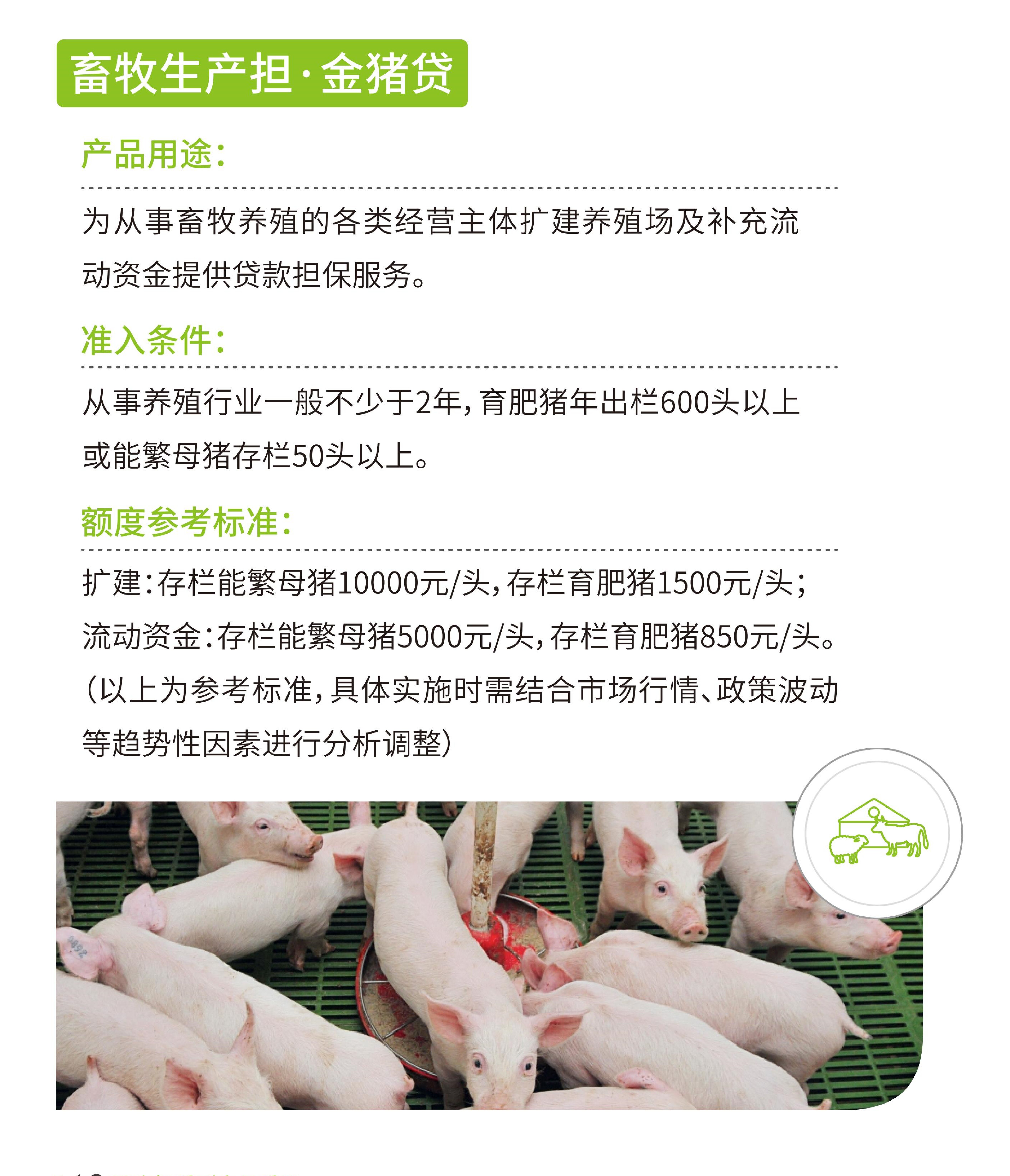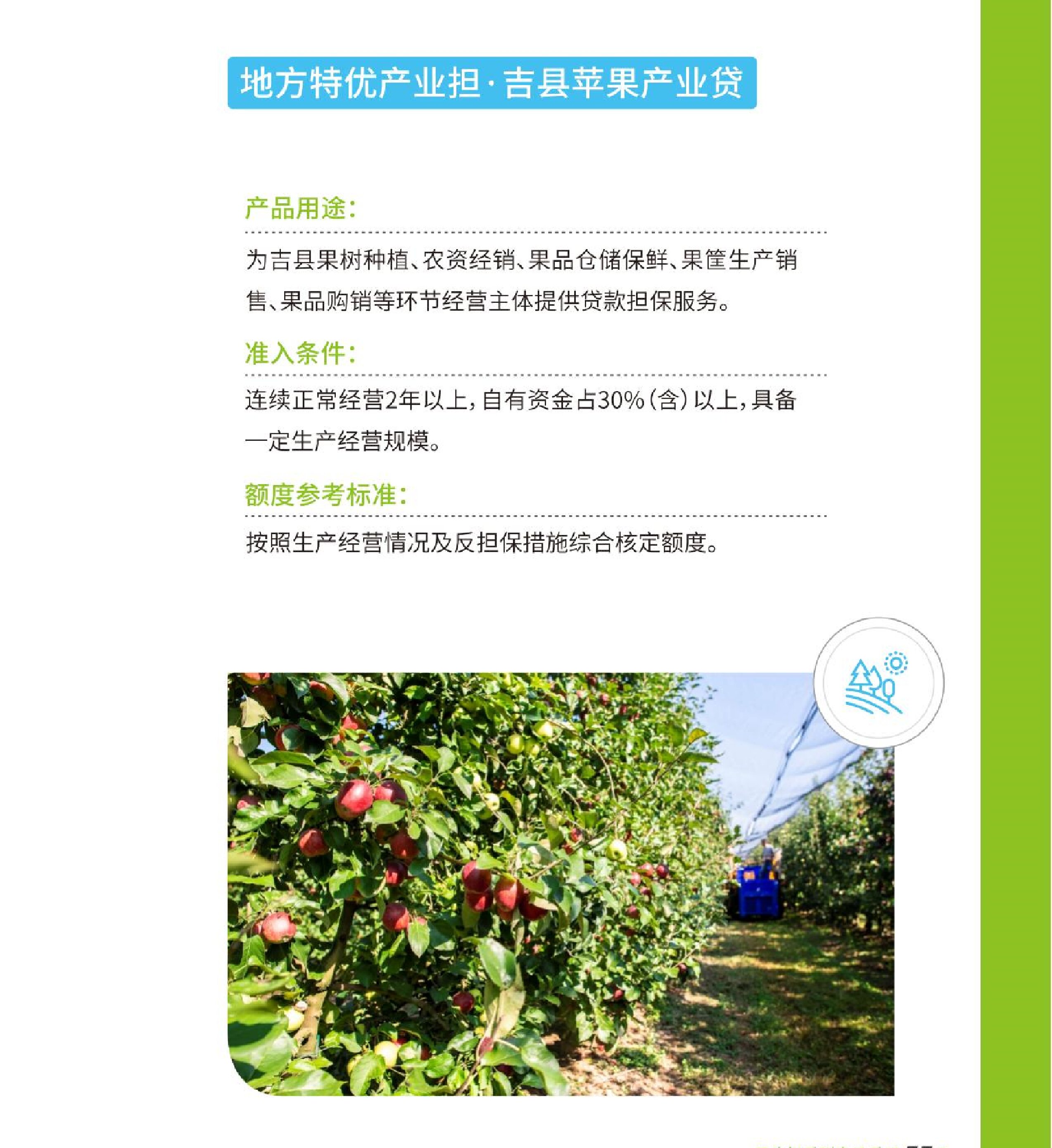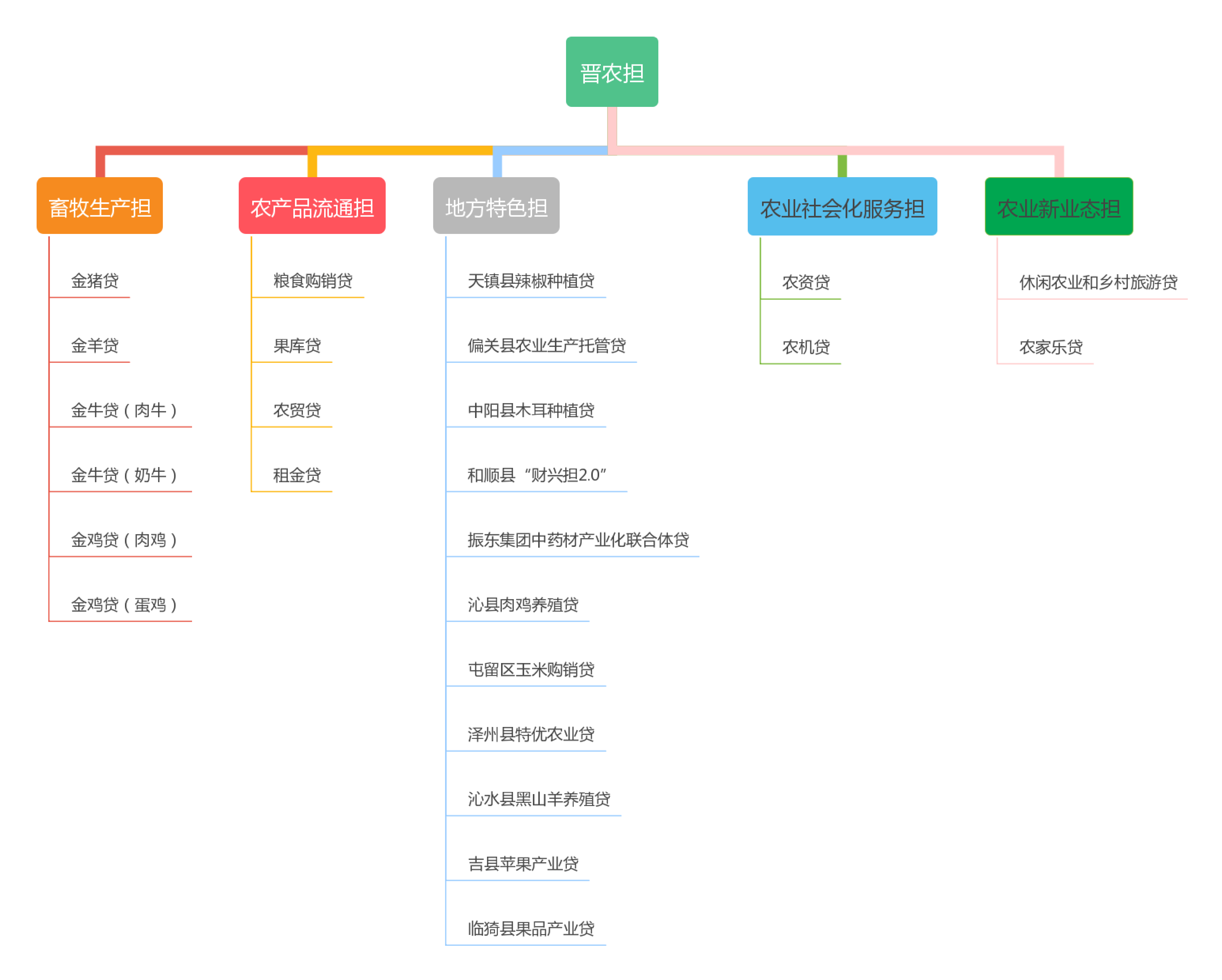 畜牧生产担·金猪贷 畜牧生产担·金羊贷 畜牧生产担·金牛贷(肉牛) 畜牧生产担·金牛贷(奶牛) 畜牧生产担·金鸡贷(肉鸡) 畜牧生产担·金鸡贷(蛋鸡) 农产品流通担·粮食购销贷 农产品流通担·果库贷 农产品流通担·农贸贷 农产品流通担·租金贷 农业社会化服务担·农资贷 农业社会化服务担·农机贷 农业新业态担·休闲农业和乡村旅游贷 农业新业态担·农家乐贷 地方特优产业担·天镇县辣椒种植贷 地方特优产业担·偏关县农业生产托管贷 地方特优产业担·中阳县木耳种植贷 地方特优产业担·和顺县“财兴担 2.0” 地方特优产业担·振东中药材产业化联合体贷 地方特优产业担·沁县肉鸡养殖贷 地方特优产业担·屯留区玉米购销贷 地方特优产业担·泽州县特优农业贷 地方特优产业担·沁水县黑山羊养殖贷 地方特优产业担·吉县苹果产业贷 地方特优产业担·临猗县果品产业贷