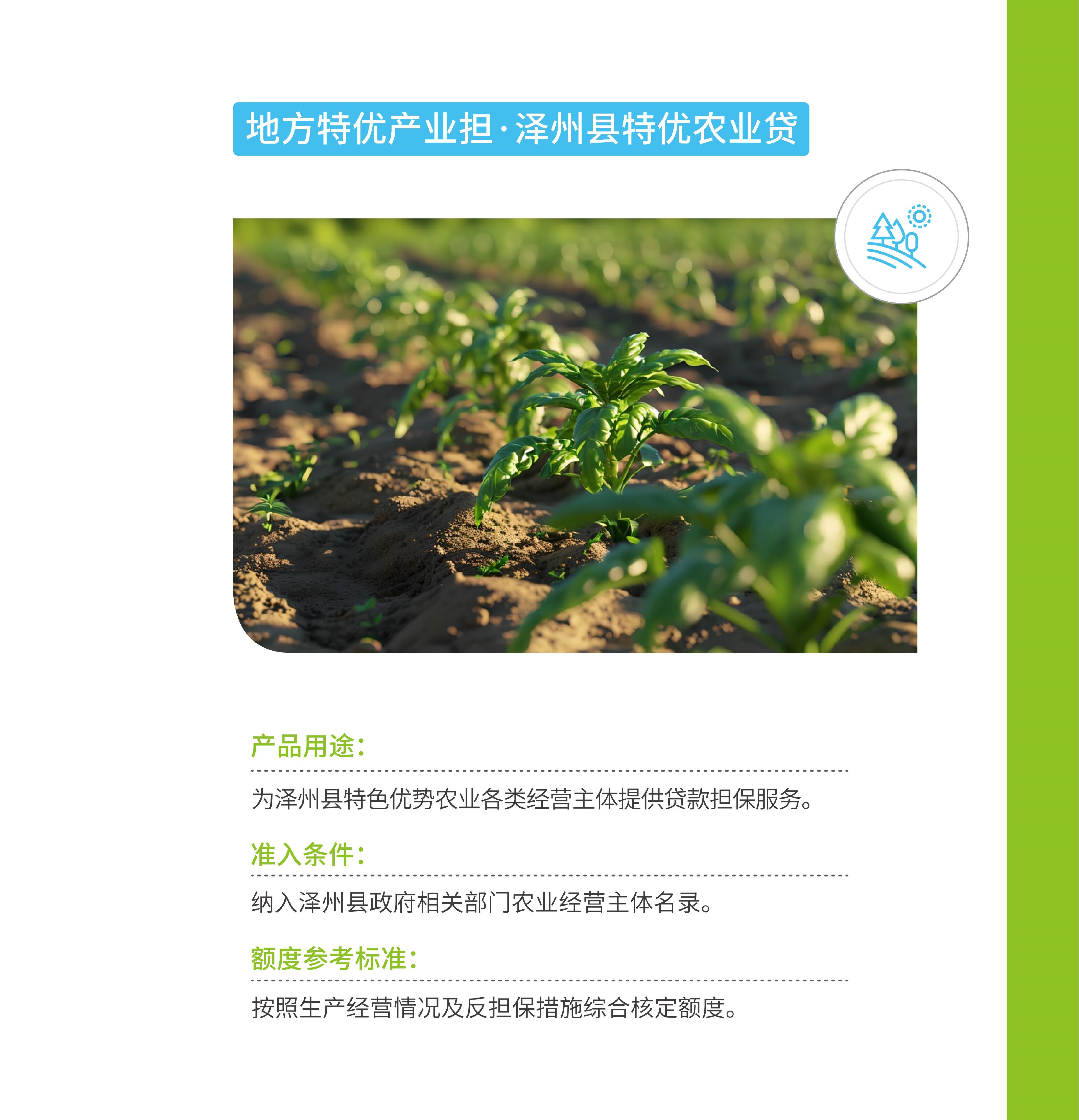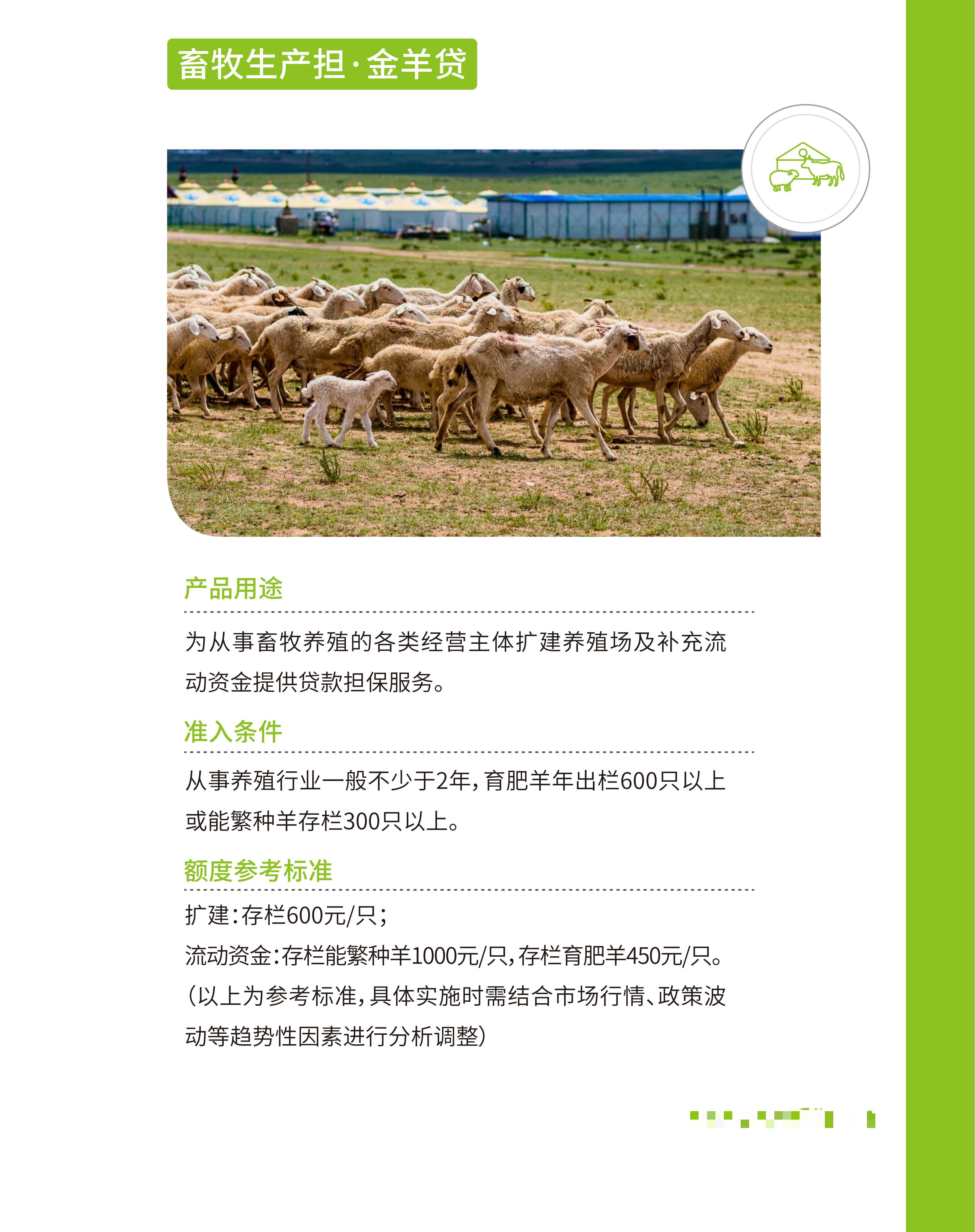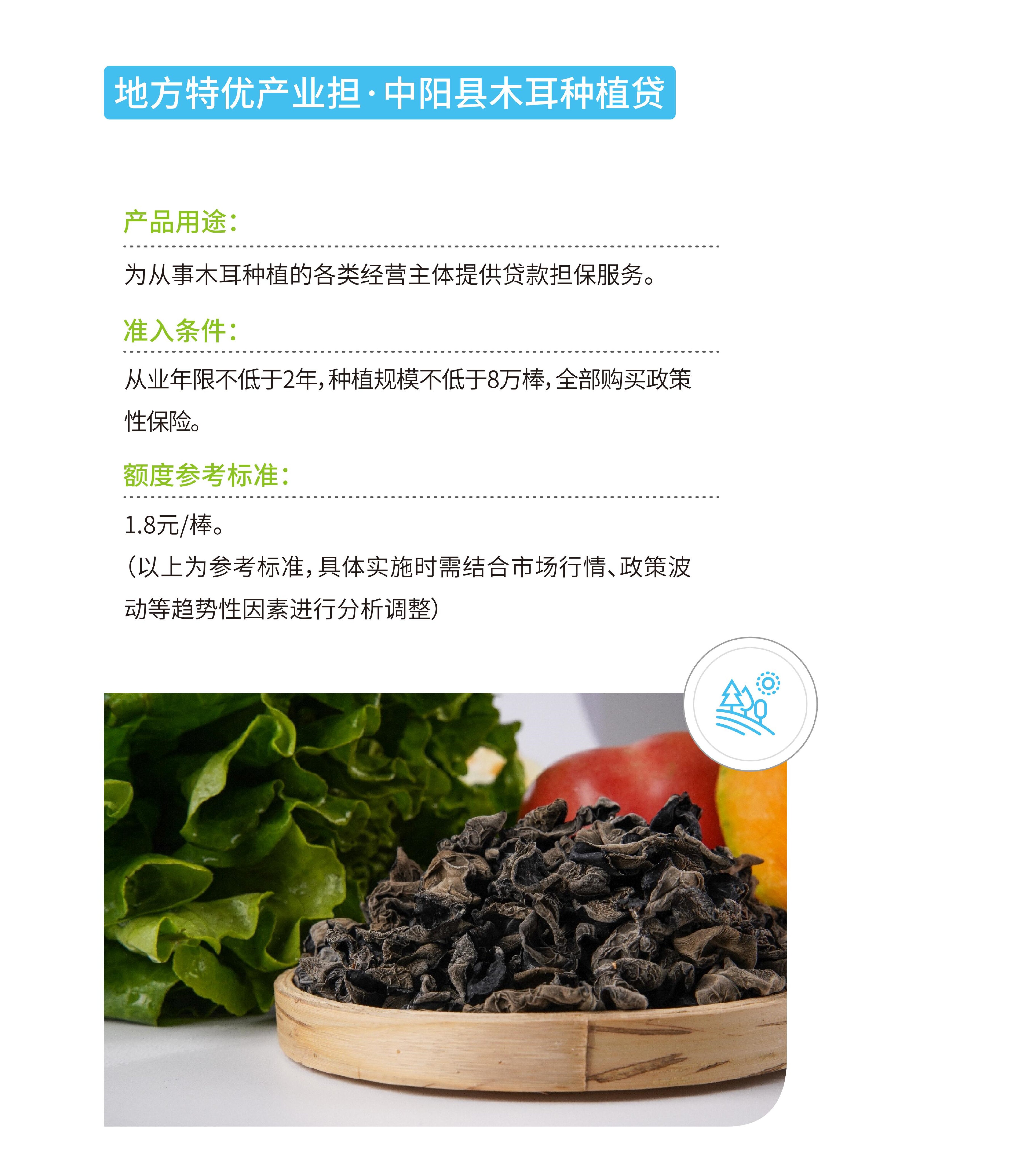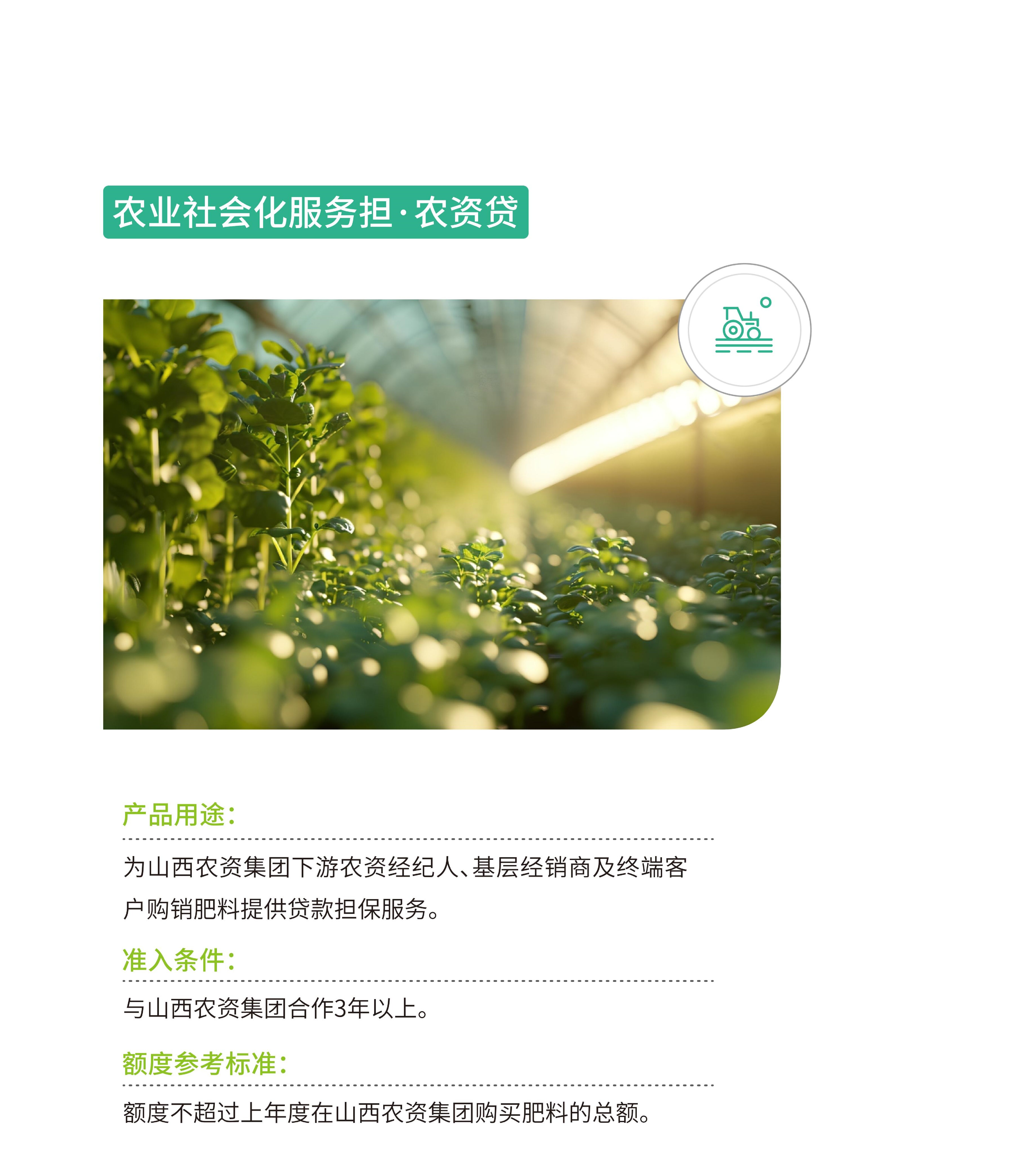 畜牧生产担·金猪贷 畜牧生产担·金羊贷 畜牧生产担·金牛贷(肉牛) 畜牧生产担·金牛贷(奶牛) 畜牧生产担·金鸡贷(肉鸡) 畜牧生产担·金鸡贷(蛋鸡) 农产品流通担·粮食购销贷 农产品流通担·果库贷 农产品流通担·农贸贷 农产品流通担·租金贷 农业社会化服务担·农资贷 农业社会化服务担·农机贷 农业新业态担·休闲农业和乡村旅游贷 农业新业态担·农家乐贷 地方特优产业担·天镇县辣椒种植贷 地方特优产业担·偏关县农业生产托管贷 地方特优产业担·中阳县木耳种植贷 地方特优产业担·和顺县“财兴担 2.0” 地方特优产业担·振东中药材产业化联合体贷 地方特优产业担·沁县肉鸡养殖贷 地方特优产业担·屯留区玉米购销贷 地方特优产业担·泽州县特优农业贷 地方特优产业担·沁水县黑山羊养殖贷 地方特优产业担·吉县苹果产业贷 地方特优产业担·临猗县果品产业贷