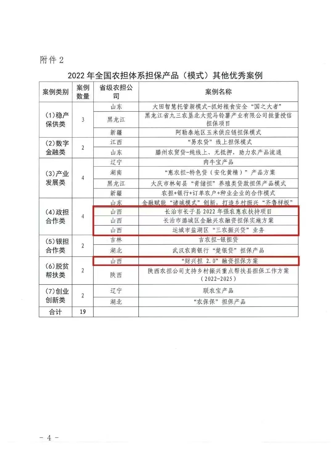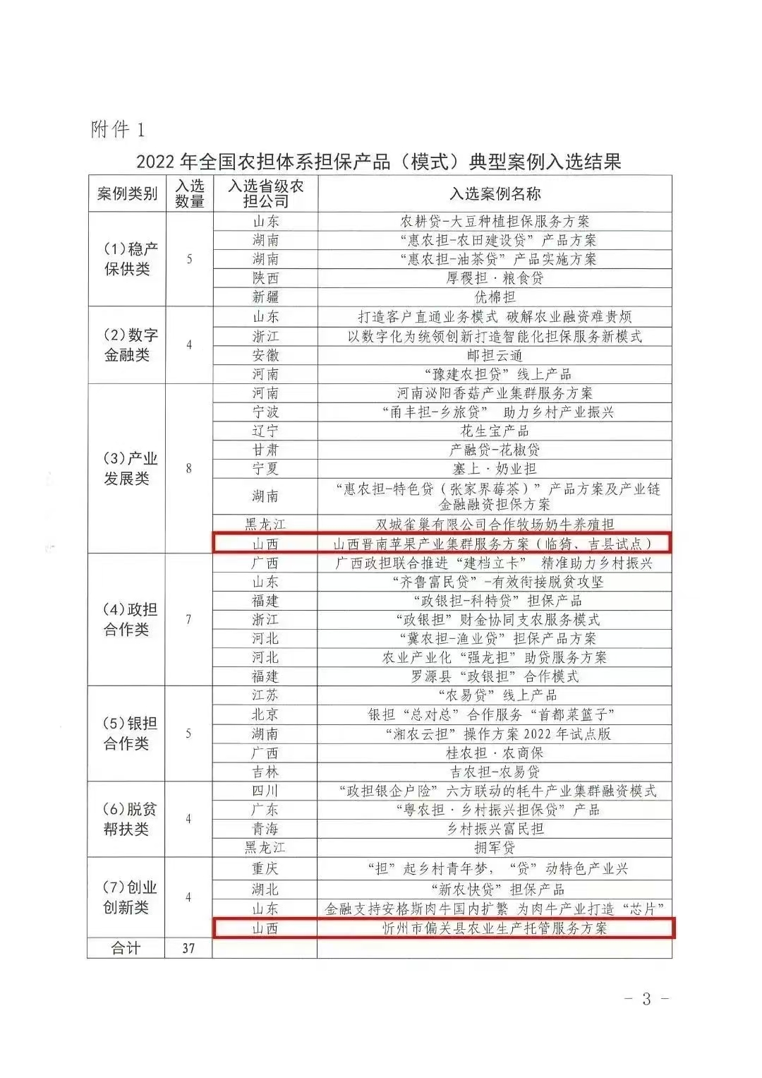 1月3日,国家农担公司公布了《关于全国农担体系担保产品(模式)案例(2022年)评审结果的通知》(国农担〔2023〕1号),根据通知,山西农担公司“晋南苹果产业集群服务方案”“忻州市偏关县农业生产托管服务方案”两个案例分别入选产业发展类、创业创新类典型案例,“长子县强农惠农扶持项目”“潞城区金融兴农融资担保方案”“盐湖区三农振兴贷业务”“财兴担2.0融资担保方案”4个案例分别入选政担合作类、脱贫帮扶类优秀案例,入选案例数在全国33家省级农担公司中排名第二。