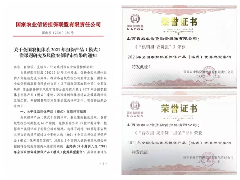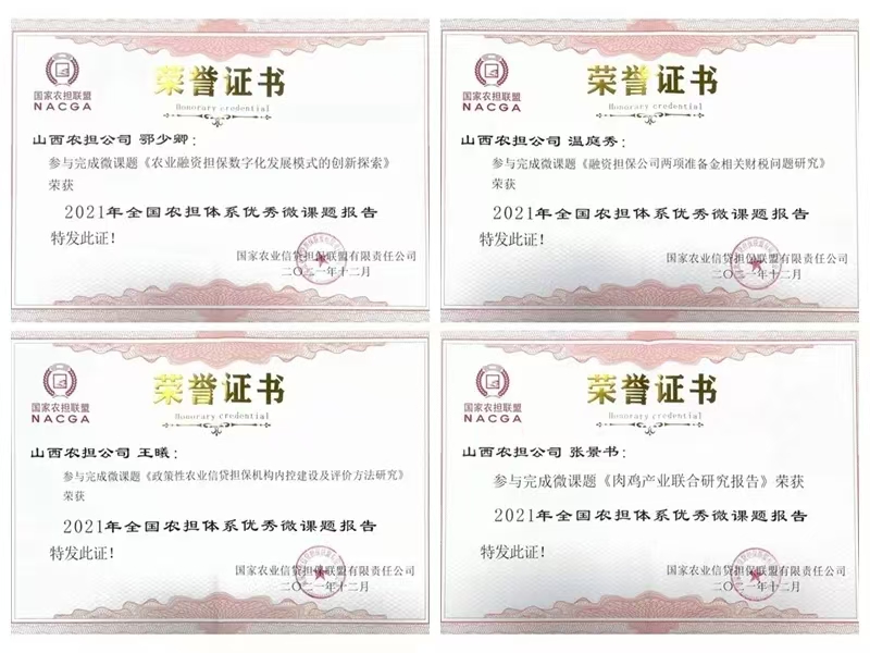 近日,国家农担公司发布全国农担体系2021年担保产品(模式)及微课题研究评审结果:山西农担上报的“晋农担—果库担”、“供销担—农资担”两项担保产品被评为优秀典型案例;鄂少卿参与完成的微课题《农业融资担保数字化发展模式的创新探索》被评为“担保业务发展与风险管理类”优秀微课题报告;温庭秀参与完成的微课题《融资担保公司两项准备金相关财税问题研究》、王曦参与完成的微课题《政策性农业信贷担保机构内控建设及评价方法研究》被评为“公司经营管理及战略发展类”优秀微课题报告;张景书参与的微课题《肉鸡产业联合研究》被评为“农业产业研究类”优秀微课题报告。